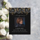 A classic black background. Decorated with black and golden flowers, florals. Personalise and add name, dates and your text.