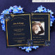 A navy blue background, a faux gold frame. Decorated with blue flowers. Personalise and add name, dates and your text.