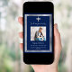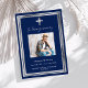 An elegant, modern, simple funeral/celebration of life invitation. A navy blue background decorated with a faux silver cross, and faux silver frames. Personalise and add a photo name and details. White text.