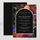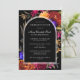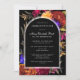 A Boho black arch provides the frame for your Celebration of Life details. The transparent edge makes it pop against the black background and Fall flowers. The elegant and traditional white text is easy to read and personalise. Fall flowers surround the Boho arch. Deep burgundy red roses, bright orange dahlias, purple pansies and dangling magenta fuchsia flowers create a dramatic vibe. The deceased person's name is written in a traditional script text. All of the text can be easily edited to create a personal remembrance.