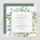Elegant celebration of a life square invitation features a botanical frame of white berries and flowers and foliage. The deceased person's name is written in a traditional script text. All of the text can be easily edited to create a personal remembrance.