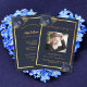 A navy blue background, a faux gold frame. Decorated with blue flowers, florals. Personalize and add name, dates and your text.