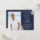 Elegant navy blue, modern garden greenery, funeral celebration of life remembrance photo invitation. Designed by Thisisnotme©