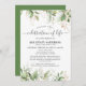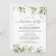 The personalised funeral memorial invitation is an ideal way to honour the deceased and celebrate their life in a respectful and dignified manner. Featuring elegant watercolor green botanical eucalyptus leaves, gold floral accents, and a celebration of life template that is easy to personalise.