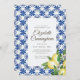 Composed of cursive script and serif typography on leafy greenery green foliage botanicals; All against a backdrop of white, yellow and blue mediterranean Spanish tiles with watercolor yellow lemons. This is a vintage celebration of life, funeral or memorial invitation.