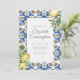 Composed of cursive script and serif typography on leafy greenery green foliage botanicals; All against a backdrop of white, yellow and blue mediterranean Spanish tiles with watercolor yellow lemons. This is a vintage celebration of life, funeral or memorial invitation.