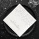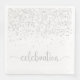Paper Dinner napkin with silver glitter and the text «celebration». The text is in a scriptfont with a swirl glyph on the start and end. This napkin is versatile and can be used for many occasions like New Year, Birthday, anniversary and other. It’s easy to match this monochrome design with other decorations and effects in silver and white.