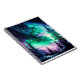 The front cover of the notebook showcases a breathtaking view of the forest and mountains at night, with a sky filled with stars and the Northern Lights in all their glory. The colours are rich and vibrant, with dark green, vivid turquoise blue, light purple and dark purple hues, creating a stunning contrast against the dark background.