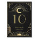 A sophisticated black and gold table number card featuring a radiant crescent‑moon motif, geometric Art Deco detailing, and personalized names and date. Designed to elevate your reception tables with celestial elegance and cohesive styling. Please note: Not real gold or gold foil.