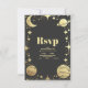 The RSVP details are presented in a combination of modern calligraphy and classic serif fonts, embossed in luxurious gold foil to match the celestial elements. The card offers a clear and organised layout for guests to respond, with options for accepting or declining the invitation, along with space for any dietary preferences or special requests.
