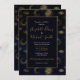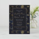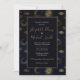 Modern universe gold celestial elements dark blue pattern, featuring a collection of moons, sun, sunburst, stars, triangles and the mystical protective evil eye talisman, in glowing faux gold foil, on a deep blue, dark blue background. A alchemy sacred geometry galaxy symbols illustration.