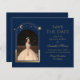 Celestial Blue Save The Date Birthday Quinceanera Invitation features a gold sun, moon and stars frame on a blue background. Inside is your favourite photo and your custom Quinceanera save the date information. Personalise by editing the text in the text boxes and adding your favourite photo. Designed for you by ©2024 Evco Studio www.zazzle.com/store/evcostudio