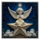 "A masterfully crafted ceramic artwork, presented as a freestanding glazed porcelain sculpture, an ornate high-relief tile, or a hand-painted design on a large pottery vessel. The central figure is a cherubic angel child with delicately sculpted blond curls, closed eyes, and hands clasped in prayer, radiating serenity. Intricately detailed white-feathered wings extend gracefully, finished with subtle satin or matte glazes for lifelike texture. The angel wears a simple pale-yellow glazed dress with gentle folds, seated serenely atop a grand, ornate five-pointed star. The star is richly adorned with incised or relief patterns, finished in shimmering gold luster glaze with possible crackle accents, symbolizing divine brilliance.