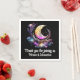 A wonderful and vibrant golden crescent moon with floral detail on it is surrounded by soft feather wisps and glowing pink, blue, white and faux gold celestial clouds which have small twinkling stars set against a midnight black background that may be changed to any colour of your choice. Ideal on wedding favour gifts at a moon and stars wedding; for your special starry night themed anniversary or for any wiccan business; lodge or resort.