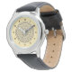 A lace-like concentric circle mandala in dark blue with bright blue and gold star-like dots spangled among the layers makes for a fun, design that brings to mind a starry night sky. This watch is available in a variety of sizes, colours, and styles, including sizes for both kids and adults.