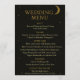 Add elegance to your reception with this celestial black and gold wedding menu, featuring a starry night backdrop with shimmering moon and constellation accents. Designed in refined script and serif fonts, the menu highlights each course from soup and salad to appetizers, main entrées (chicken, beef, fish, and vegan options), dessert, and a signature drink. Perfect for celestial weddings, black-tie events, or evening celebrations, this customisable menu coordinates beautifully with matching invitations, RSVP cards, Save-the-Dates, thank-you notes, and enclosure cards. Printed at 350 DPI on premium cardstock for a luxurious finish.