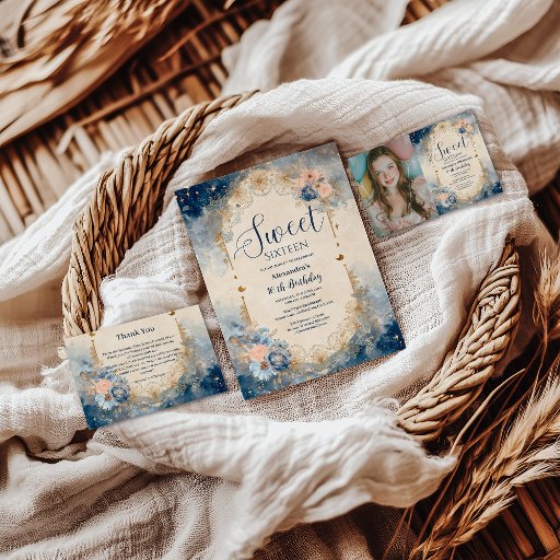 A dreamy Sweet Sixteen design inspired by Art Nouveau illustration and celestial night skies. Soft ivory tones blend with deep blue accents, hand-painted florals, and delicate gold-style details for an elegant, almost storybook feel.