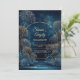 Step into an ethereal world of magic with this breathtaking midnight forest design. This invitation centers on a delicate, glowing gold circular frame set against a deep navy blue background filled with shimmering bokeh light and celestial sparkle. At the base, lush dark blue shrubs meet golden, dandelion-like allium puffballs that seem to glow with an inner light, reflecting softly off a rippling water effect. The vibe is one of pure enchanted romance, perfect for a high-end celebration held under a starlit sky. This is a wedding invitation created for formal evening ceremonies, magical forest celebrations, or celestial-themed garden events.