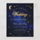 A budget wedding invitation for a celestial wedding theme, with the gold stars and crescent moon on a starry night blue background. The word Wedding and the names are written in an elegant calligraphic script. The moon and the word Wedding are faux gold foil, the rest of the text is golden. On the black, there is only the moon and star on a starry night blue background.