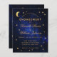 A budget engagement invitation for a celestial wedding theme, with the moon and star on a starry night blue background. The names are written in an elegant calligraphic script. The moon and the stars are faux gold foil, the text is golden. On the black, there is only the moon and star on a starry night blue background.