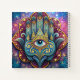 An artistic and detailed representation of the hand of Fatima, a powerful symbol of protection and good fortune, adorned with intricate designs and an all-seeing celestial eye.