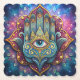 An artistic and detailed representation of the hand of Fatima, a powerful symbol of protection and good fortune, adorned with intricate designs and an all-seeing celestial eye.