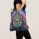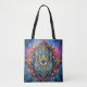 An artistic and detailed representation of the hand of Fatima, a powerful symbol of protection and good fortune, adorned with intricate designs and an all-seeing celestial eye.