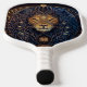 This modern pickleball paddle design features a dark blue and black background with a celestial lion head in gold and blue, and with your initial in bold gold text for a look that is simple and stylish, yet professional.