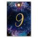 Celestial Moon Phase Table Number Cards. Just change the number out and have some amazing metaphysical table number cards for your wedding. The cards feature a glowing moon phase at the top and a blue and purple galaxy night sky background. Gold embellishments adorn the edges. Matching products are in our store with this design.