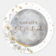 Elegant favour and / or envelope seal Bat Mitzvah sticker with beautiful watercolor celestial moon and stars design coordinating our "Chic Celestial Silver, White and Gold Bat Mitzvah" invitation. Same design from the back of invitation. Dainty stars, Bat Mitzvah phrase and corner moon details in faux gold foil. Personalise this design with your own name. Ideal for a silver and gold or white and gold celestial theme! Part of our" White, Gold and Silver Celestial Stars and Moon" collection with a variety of coordinating products available. Visit the entire collection at: https://www.zazzle.com/collections/gold_white_and_silver_celestial_stars_and_moon-119446192561160871