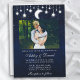 Celestial wedding invitation. Watercolor blue night sky with stars, the moon and string lights. Couple Photo.