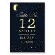 Celestial Moon Stars Midnight Blue Wedding Table Number. This design features twinkling star lights with a glowing crescent moon in the starry night sky.