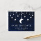 Celestial Save The Date engagement announcement postcard. Watercolor blue night sky with stars and the moon. Bokeh string lights.