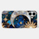 Elegant iPhone case featuring a stunning stained glass style celestial design with a crescent moon, radiant sun, and sparkling stars set against a deep blue galaxy background. The rich colours and gold accents create a bold, luxurious, and mystical look.
