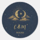 Elegant navy and gold celestial sticker with a crescent moon and stars. Perfect for invitation envelope seals or wedding favors. Part of the Starry Night collection.