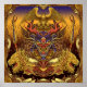 Powerful, horned oni mask surrounded by winged lions, a majestic eagle, and ornate, decorative elements. The oni mask is adorned with intricate details and has a fierce, menacing expression.