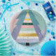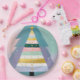 An abstract and spiritual painting dominated by a central, stylized Christmas tree. The tree is composed of horizontal bands of color in soft, muted pastels including pink, mint green, gold, and lavender. It stands in a white, textured snowy foreground adorned with sparkling gold glitter dots. The background features soft, layered fields of pink, blue-green, and purple wash, suggesting a hazy sky. Two celestial elements are prominent: a simple white moon on the left and a highly stylized, radiant gold star or sunburst on the upper right. The overall effect is sophisticated, gentle, and abstractly festive.