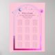 Celestial Pink Purple Sun Moon Stars Mystical Wedding Seating Chart Wedding Sign Poster Prints features a pink and purple sun, moon and stars frame on a pink background. Inside the frame is the text "Welcome" in elegant pink calligraphy script and your custom wedding reception seating chart information. Designed for you by ©2022 Evco Studio www.zazzle.com/store/evcostudio