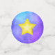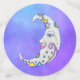 This table confetti has a celestial theme with sky backgrounds in pretty colours of blues, purples, and pinks. Large circles have a fancy white crescent moon decorated with colourful shapes and a face, small circles have yellow stars.