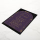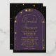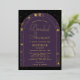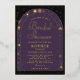A modern, elegant bridal shower invitation template with a celestial, moon and stars, tarot, fortune teller theme, featuring a double, gold boho arch frame and celestial elements: the sun, the moon, the chalice, constellations, stars... on a purple, black and gold colour scheme. Real gold foil accents elevate this invitation to an elegant affair. A lovely space, universe, horoscope, zodiac, celestial themed bridal shower invitation design for a modern bride.