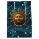 Amid a starry celestial background, the serene face of a stylised golden sun.