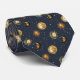 An elegant celestial pattern necktie featuring golden suns, crescent moons, and scattered stars set against a deep midnight blue background. Inspired by vintage astrology and mystical night skies, this seamless design blends luxury gold textures with cosmic symbolism.