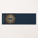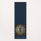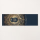 Ancient celestial sun moon faces yoga mat, personalised with your name in a flourished decorative type, on a midnight blue background. Bold and ethereal.