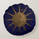 Hand drawn peaceful man on the moon and sun and stars in a brass, bas relief graphic over a textured night sky. See this design on throw pillows, blankets and duvet covers.