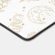 This enchanting pattern features a curated collection of mystical symbols rendered in soft gold tones on a clean white background. Stylised cat faces with third eyes, radiant suns, crescent moons, snakes, feathers, and open hands with eye motifs are arranged in a symmetrical, repeating layout. Each element carries a sense of spiritual curiosity and cosmic wonder, blending astrology, folklore, and dreamlike imagery into a harmonious visual tapestry. The design evokes a sense of magic, balance, and introspection.