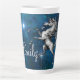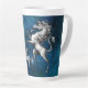 Beautiful latte mug design features vintage heraldry style unicorn illustration set on celestial skies background. Customise with name or other text in white script font.