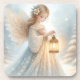 A serene winter angel stands in a gentle snowfall, holding a softly glowing lantern that casts warm light across a peaceful forest scene. Her delicate wings, embroidered gown, and hand placed tenderly over her heart evoke a feeling of comfort, hope, and quiet blessing. Soft blues, warm golds, and subtle winter florals blend together to create a dreamlike seasonal moment filled with emotion and grace. The angel’s contemplative pose and the lantern’s radiance offer a sense of guidance, stillness, and spiritual warmth, making this design ideal for winter décor, thoughtful holiday imagery, and meaningful keepsakes. AI generated artwork.