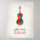 Bright, colourful Cello design that says "Above all else… Cello". Warm colours of red, orange, turquoise and aqua in a watercolor style pattern on a neutral background.