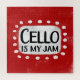 "Cello Is My Jam" is a fun text design with a white accent shape surrounded by white whimsical textured dots.