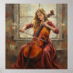 A young blonde woman in a flowing red dress plays a cello gracefully by a sunlit window, captured in soft, impressionistic brushstrokes evoking timeless elegance and musical passion.